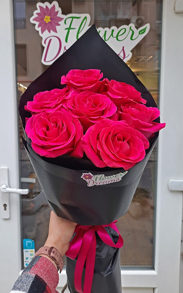 Перфектният букет от 7 големи, ароматни цикламени рози стилно опаковани в черна хартия. Изненадата с този букет е гарантирана!