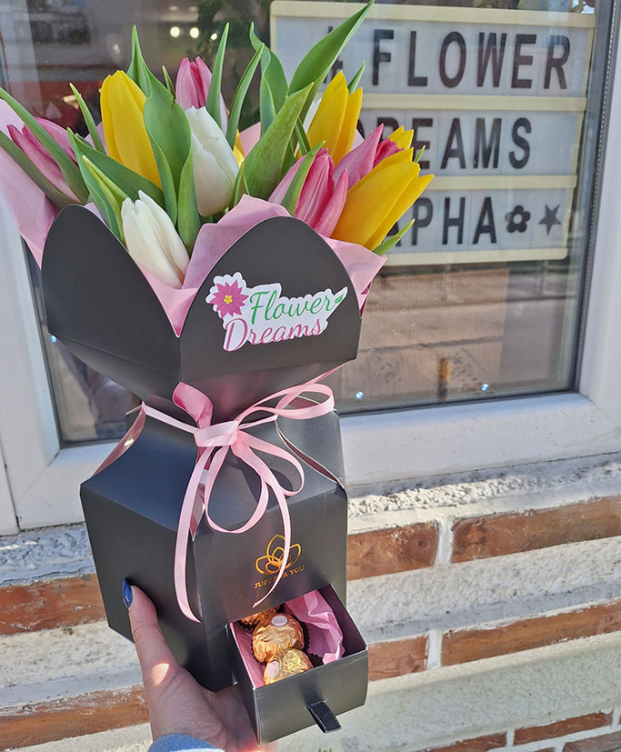 Букет от 13 лалета в интресна картонена опаковка с чекмедже. Вътре ще откриете изненада от бонбони Ferrero Rocher. Поръчайте пролетно настроение!